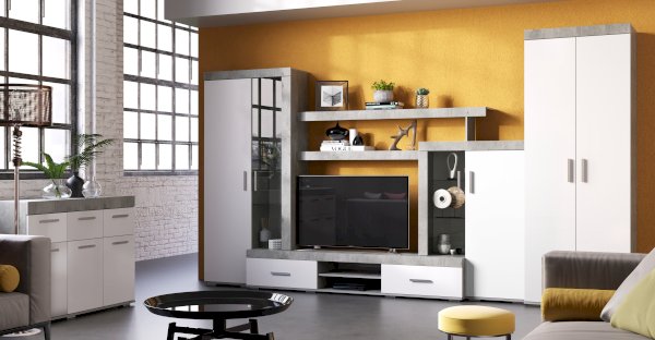 Гостиная Инстайл является частью одноименной модульной коллекции, все предметы которой идеально сочетаются между собой. Цвет бетон корпуса в комбинации с белыми матовыми фасадами и вставками из стекла придают гостиной Интсайл легкости. Два распашных шкафа, в один из которого встроена хромированная штанга, позволят разместить личные вещи и предметы гардероба. На нескольких открытых полках вы сможете хранить сувениры, фотографии или предметы декора.