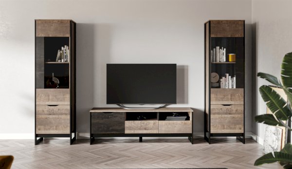 Оригинальная функциональная стенка Стокгольм впишется в любое современное пространство гостиной в квартире или загородном доме. Особенность дизайна – это сочетание реалистичных по цвету и тактильности трендовых декоров, которые соответствуют последним городским тенденциям. «Дуб Гранж» привлекает песочным оттенком и имитацией вручную обработанного дерева с выразительной зернистой текстурой, характерной формой досок. Стильный серый цвет «Железного камня» с металлическими разводами и новая текстура состаренной штукатурки в сочетании с гладкостью металла вносят индустриальный колорит. Оригинальные ножки-опоры из контрастного профиля МДФ, расположенные по бокам модулей, имитируют металл и подчеркивают стиль коллекции. Витрины из стекла создают ощущение свежести, легкости и чистоты.