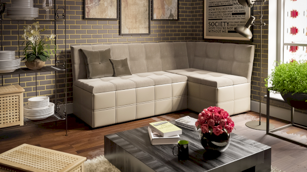Новинка является многофункциональным предметом мебели, ведь в обычном виде скамья угловая поможет удобно разместиться за обеденным столом, а механизм трансформации превращает его в полноценное спальное место для гостей, оставшихся ночевать. Для раскладывания необходимо выложить подушки, которые входят в комплект, на выдвигаемую часть скамьи. Модель позволит Вам отказаться от большого количества подвесных полок и дополнительных модулей за счёт того, что в ней имеется вместительное место для хранения под сидением.