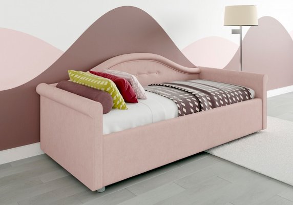 Кровать для девочки с изысканным изгибом спинки и округлыми формами подарят вашему ребенку волшебные мгновения сна. Разнообразие вариантов обивки сделает кровать неповторимой. Модель изготовлена из ДСП. В комплект кровати для девочки входит кроватное основание без опор. Каркас основания выполнен из металла, ламели - из берёзы.