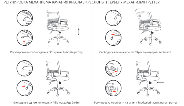 Кресло оснащено механизмом качания «топ-ган» с регулировкой под вес пользователя и возможностью фиксации спинки в рабочем положении.