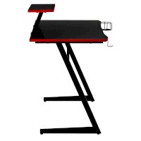 Конструкция простая и прочная: стальная рама выдержит серьезную нагрузку (заявлено до 200 кг). Стол на двух L-образных опорах впишется в любой уголок дома, его легко перемещать, удобно собирать и  разбирать. Несмотря на лаконичность дизайна, он очень стильно смотрится: строгая черная столешница «под карбон» отделана красной кромкой.
