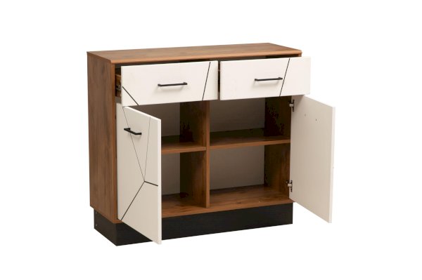 Комод имеет небольшие размеры, но в него помещается все, что нужно. Два выдвижных ящика сверху – для бумаг, счетов, документов, либо для нижнего белья (если комод стоит в спальне). Ящики снабжены шариковыми направляющими, которые обеспечивают плавный ход выдвижения. Под выдвижными ящиками находятся два отсека с полками из ЛДСП – в каждом по две. Полки разного размера – верхние чуть поменьше, нижние – более вместительные. Каждая из полок выдерживает вес до 5 кг. Полки закрываются распашными дверцами.