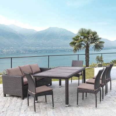 В составе комплекта: стол - столешница декинг, трех местный диван и 5 стульев. Высококачественная лоза из полиротанга коричневого цвета стойкая к любым атмосферным явлениям. Крепкий стальной каркас с полимерным антивандальным покрытием и отличным качеством сварки. Изделие сплетено вручную нашими мастерами под жестким контролем качества на каждом этапе производства. Лоза максимально приближена по рельефу и текстуре к естественному материалу. Идеально подходит для использования на улице и внутри помещения в любую погоду. Не боится воды, солнца и минусовой температуры.