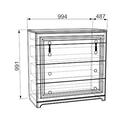 Комод: Корпус – ЛДСП 16 мм Фасады – МДФ с пленкой ПВХ и патиной Кромка – ПВХ 0,4 мм Направляющие – шариковые Ручки – фарфоровые Декор – кисти для штор Опоры – пятниковые
