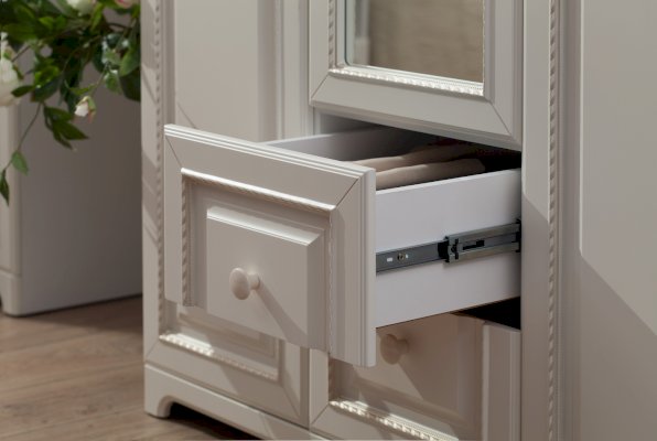 Шкаф 4-створчатый: Корпус – ЛДСП 16 мм Фасады – МДФ с пленкой ПВХ и патиной Кромка – ПВХ 0,4 мм Зеркало – 4 мм Направляющие – шариковые Ручки – фарфоровые Опоры – пятниковые Декор – кисти для штор