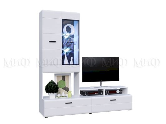 Изысканная, белоснежная с приятным блеском гостиная, несомненно украсит собой любую квартиру или дом. В гостиной есть все необходимые элементы для красивого оформления комнаты. Фасады с фрезеровкой и стеклянные витрины создают современный и стильный образ вашему дому.