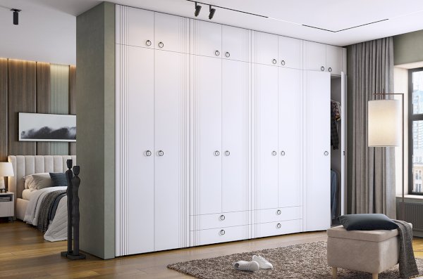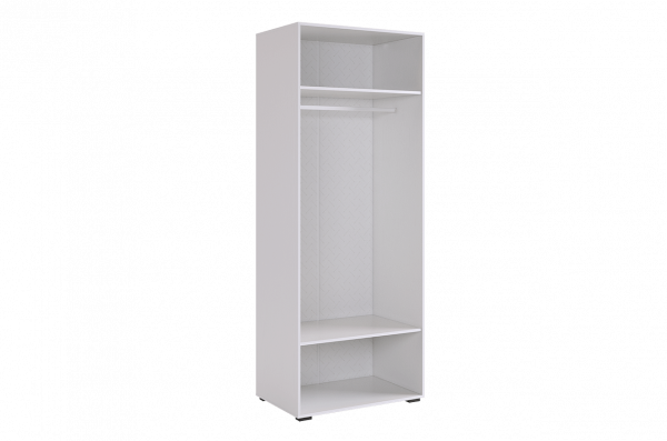 Что делает этот шкаф особенным? Его корпус изготовлен из ЛДСП белого дерева, что придает ему легкость и свежий вид. Фасады, выполненные из МДФ и облицованные пленкой ПВХ белого матового цвета, добавляют шкафу элегантности. Уникальной особенностью дизайна являются вертикальные полосы на фасаде, созданные с помощью фрезеровки. Петли с доводчиком гарантируют бесшумное закрывание фасадов, залог вашего комфорта. Удобные металлические ручки облегчают открывание и закрывание шкафа, а штанга для одежды и полки дополнительно обеспечивают удобное размещение и организацию внутреннего пространства. Ножка пластиковая черного цвета дополняет общую композицию, а ее высота в 20 мм придает шкафу легкость и стабильность.