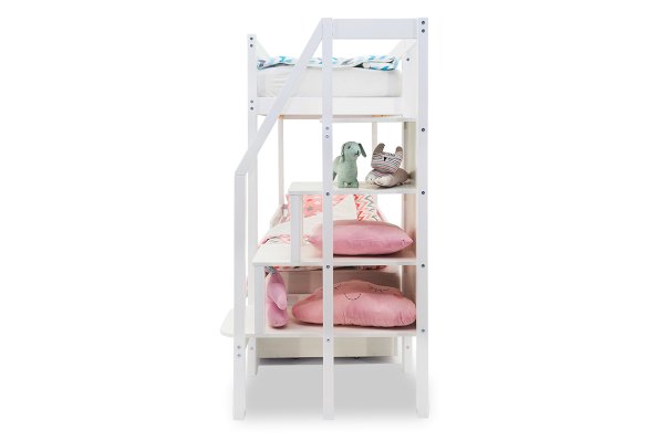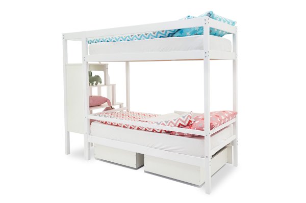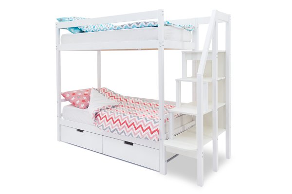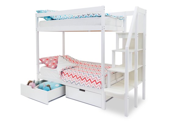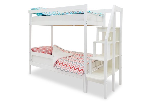 Благодаря своей конструкции, при которой оптимальна высота между ярусами и ширина спальных мест, кровать комфортна и удобна для сна и игр. Лестница и ящики под кроватью – это отличные места для хранения любых вещей.