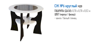 Небольшой журнальный столик №6 — это стильный и броский предмет обстановки. Необычным и запоминающимся его делают ножки необычной конфигурации и привлекающее внимание сочетание двух контрастных цветов: ослепительного белого глянца и темно-коричневого венге. Благодаря круглой форме он занимает минимум места и может использоваться даже в весьма тесных помещениях.