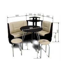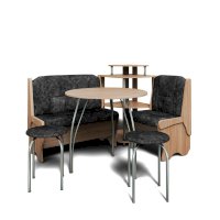 Оригинальный кухонный уголок Лотос отличается от других похожих кухонных гарнитуров. Он состоит из двух отдельных диванчиков и этажерки, заменяющей угловую мягкую часть. Круглый кухонный стол в отличие от других наборов мебели на металлическом основании как и два круглых табурета. Набор мебели для кухни включающий в себя большую прямую скамью,малую прямую скамью,угловую этажерку, стол на металлических ногах и два табурета на металлокаркасе. В прямых скамьях под сиденьями расположены ящики.