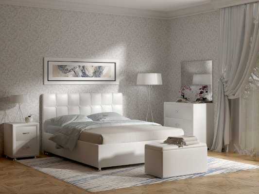 Элегантная интерьерная кровать с изголовьем, украшенным декоративными пуговицами, которые можно заменить на стразы. Модель изготовлена из ДСП. В комплект кровати входит кроватное основание. Каркас основания выполнен из металла, ламели - из берёзы. При необходимости в комплект можно включить подъемный механизм с бельевым ящиком.