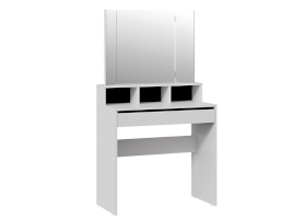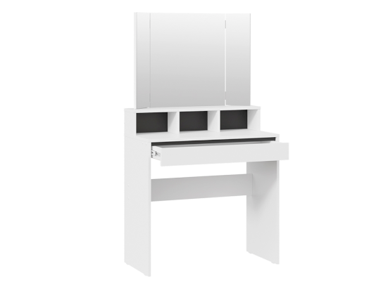 Туалетный стол «Софт» в белом цвете идеально подойдет как для светлого помещения, так и для интерьеров в темных тонах. Черные вставки на задней стенке под зеркалом и над выдвижным ящиком создают современный и стильный дизайн, который подходит для любых интерьеров. Черные элементы дизайна являются лаконичными акцентами, которые придают туалетному столу утонченность и изысканность.