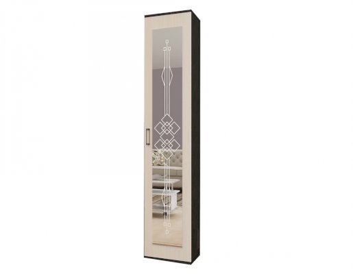Пенал представлен в двух исполнениях – со вставками из эко кожи и с зеркалом (зеркало с пескоструйной обработкой). В центральной секции верхние створки устроены по принципу купе.