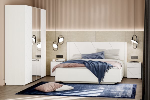 Все ручки в мебели — скрытые. Элементы изголовья кровати обтянуты мягким кожзамом, а оригинальное основание с эффектом «парения» преображает интерьер. В выдвижных ящиках используется система скрытых направляющих Quadro stop control, что позволяет легко и почти бесшумно использовать ящики. Большие зеркала шкафа визуально расширяют пространство комнаты и сделают утренние и вечерние ритуалы еще приятнее.