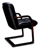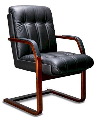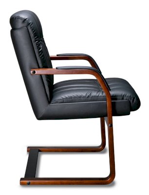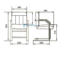 Кресло с низкой спинкой на деревянных полозьях, с подлокотниками прямоугольной замкнутой формы с мягкими накладками обитыми в цвет кресла.