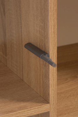 Створки оснащены петлями с доводчиками, ящики — шариковыми направляющими полного выдвижения и ручками из натурального массива дуба. В конструкции стеллажа предусмотрен механизм открывания нажатием «push-to-open».