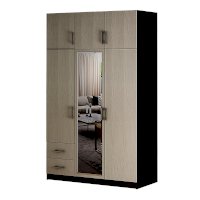Очень вместительная модель трехстворчатого шкафа с ящиками будет прекрасно смотреться в вашей спальне. Изделие состоит из нескольких зон для хранения одежды и обуви, включая два выдвижных ящика для мелких вещей, отделение для одежды на вешалках и вместительные полки. В центральную створку вставлено зеркало, что помимо основной функции, позволяет визуально расширить пространство. Сочетание тёмного корпуса и светлых фасадов позволит шкафу стать частью практически любого интерьера.