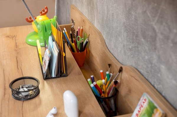 Стол отличается нестандартным решением для столешницы, которая максимально адаптирована для потребностей современных детей и работе на компьютере. Под откидной её частью, открывающейся за плавный вырез, прячется ниша для хранения и отверстие для вывода проводов, чтобы они не запутывались и не мешали ребенку.