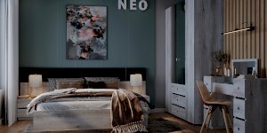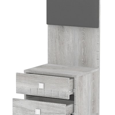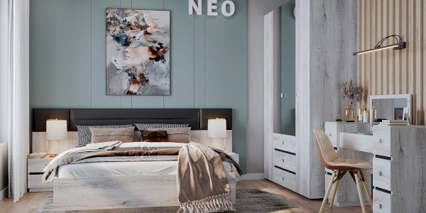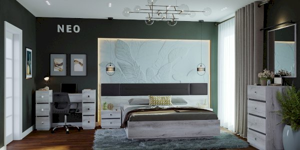 Прикроватная тумба NEO 41 с двумя выдвижными ящиками и высокой мягкой спинкой – красивый и функциональный модуль. Изюминка тумбы - комбинированная задняя стенка, возвышающаяся над столешницей: ее нижняя часть из ЛДСП, а верхняя с подушечкой из экокожи цвета Асфальт. Когда тумба приставлена к кровати, тогда она составляет единую композицию с изголовьем. Дополняют тумбу интересные ручки на ящиках: в обычном состоянии - это плоские прямоугольные кнопки, а при необходимости выдвинуть ящик средняя часть приподнимается кончиками пальцев.