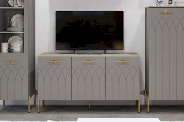 Большой комод - модное решение для современного интерьера. Мягкие серые оттенки «мокко» и «силк анис» сочетаются с золотым декором и яркой лицевой фурнитурой.
