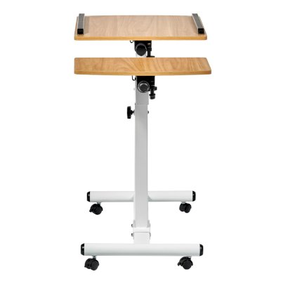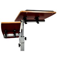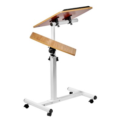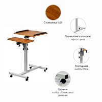 Столик оборудован поворотной столешницей из МДФ, состоящей из двух  независимых частей,  и металлическим основанием. Угол поворота столешницы составляет 180°, вплоть до вертикального положения. Высота подъема регулируется в диапазоне от 62 до 96 см. На столешнице имеются ограничители для ноутбука, планшета, предотвращающие падение гаджета.