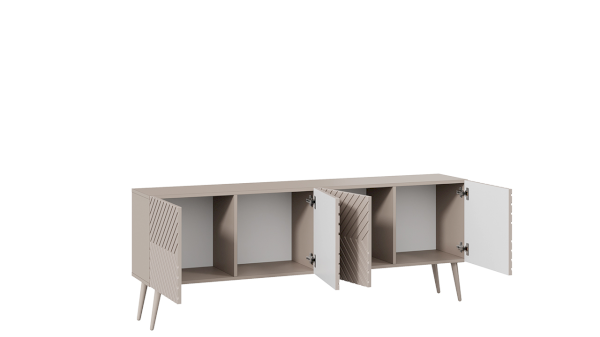За привлекательными фасадами, которые открываются с помощью системы push-to-open, расположены четыре вместительные ниши, что позволяет разместить необходимые предметы и аппаратуру.