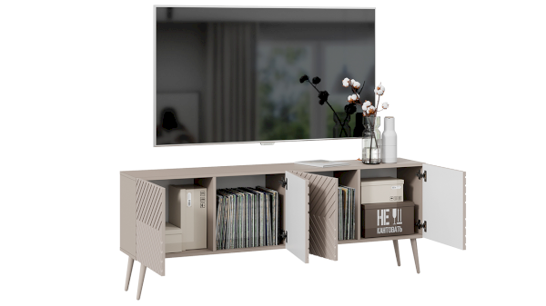 Тумба под ТВ обладает геометрическим силуэтом и привлекательной цветовой палитрой, превращая новинку в стильный модуль, который прекрасно дополнит современный интерьер гостиной.