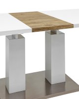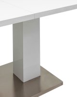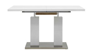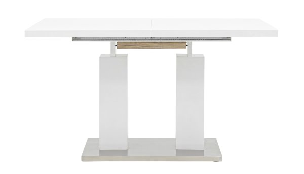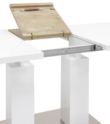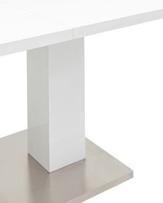 Обеденный стол раскладной. Столешница выполнена из прочного и долговечного МДФ. Светлая глянцевая поверхность столешницы гармонично сочетается с металлическими ножками. Простая прямоугольная форма стола позволит легко вписать его в современный интерьер, стол украсит кухню, гостиную или современное кафе, ресторан. Дополнительная вкладка стола выполнена из МДФ с бумажным шпоном цвета беленого дуба. На вкладке предусмотрена петля для комфортного открытия стола одной рукой.