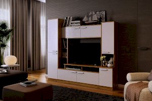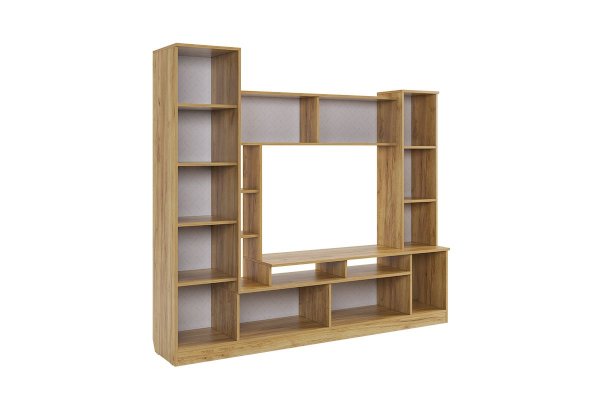Состоит из: открытых полок, закрытых полок, ниши под телевизор